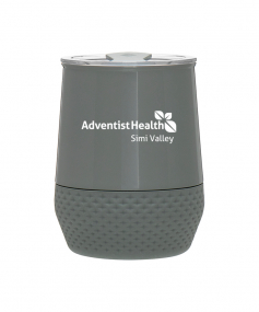 12 oz double wall 18/8 stainless steel thermal tumbler with copper vacuum insulation, push-on lid, matching swivel closure, and removable silicone base.