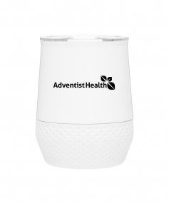 12 oz double wall 18/8 stainless steel thermal tumbler with copper vacuum insulation, push-on lid, matching swivel closure, and removable silicone base.
