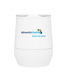 12 oz double wall 18/8 stainless steel thermal tumbler with copper vacuum insulation, push-on lid, matching swivel closure, and removable silicone base.