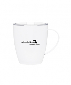 12 oz double wall 18/8 stainless steel thermal mug with copper vacuum insulation, clear acrylic push-on lid, and matching swivel; Hand wash recommended; Do not microwave; 4-7/16" h x 4"w (4-7/8 with handle) ; 355mL.