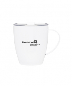 12 oz double wall 18/8 stainless steel thermal mug with copper vacuum insulation, clear acrylic push-on lid, and matching swivel; Hand wash recommended; Do not microwave; 4-7/16" h x 4"w (4-7/8 with handle) ; 355mL.