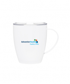 12 oz double wall 18/8 stainless steel thermal mug with copper vacuum insulation, clear acrylic push-on lid, and matching swivel; Hand wash recommended; Do not microwave; 4-7/16" h x 4"w (4-7/8 with handle) ; 355mL.