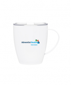 12 oz double wall 18/8 stainless steel thermal mug with copper vacuum insulation, clear acrylic push-on lid, and matching swivel; Hand wash recommended; Do not microwave; 4-7/16" h x 4"w (4-7/8 with handle) ; 355mL.