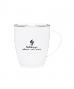 12 oz double wall 18/8 stainless steel thermal mug with copper vacuum insulation, clear acrylic push-on lid, and matching swivel; Hand wash recommended; Do not microwave; 4-7/16" h x 4"w (4-7/8 with handle) ; 355mL.