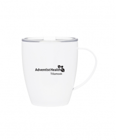12 oz double wall 18/8 stainless steel thermal mug with copper vacuum insulation, clear acrylic push-on lid, and matching swivel; Hand wash recommended; Do not microwave; 4-7/16" h x 4"w (4-7/8 with handle) ; 355mL.