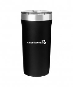 18 oz double wall 18/8 stainless steel thermal tumbler with vacuum insulation, brushed stainless steel rim, clear push-on acrylic lid with sliding closure, and powder coated finish. Hand wash recommended. Do not microwave. Complies with FDA, Prop 65. 7.25" H x 3.5" W
