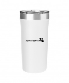 18 oz double wall 18/8 stainless steel thermal tumbler with vacuum insulation, brushed stainless steel rim, clear push-on acrylic lid with sliding closure, and powder coated finish. Hand wash recommended. Do not microwave. Complies with FDA, Prop 65. 7.25" H x 3.5" W