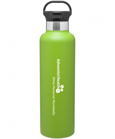 24 oz powder coated double wall 18/8 stainless steel thermal bottle with copper vacuum insulation, threaded gear-shaped insulated lid and carrying handle Complies with FDA, Prop 65. 11.25" H x 3" W