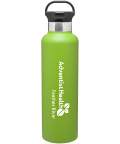 24 oz powder coated double wall 18/8 stainless steel thermal bottle with copper vacuum insulation, threaded gear-shaped insulated lid and carrying handle Complies with FDA, Prop 65. 11.25" H x 3" W