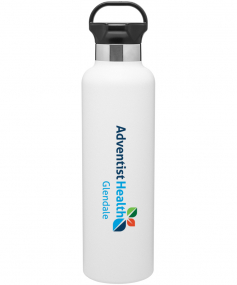 24 oz powder coated double wall 18/8 stainless steel thermal bottle with copper vacuum insulation, threaded gear-shaped insulated lid and carrying handle Complies with FDA, Prop 65. 11.25" H x 3" W
