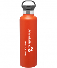 24 oz powder coated double wall 18/8 stainless steel thermal bottle with copper vacuum insulation, threaded gear-shaped insulated lid and carrying handle Complies with FDA, Prop 65. 11.25" H x 3" W