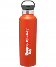 24 oz powder coated double wall 18/8 stainless steel thermal bottle with copper vacuum insulation, threaded gear-shaped insulated lid and carrying handle Complies with FDA, Prop 65. 11.25" H x 3" W
