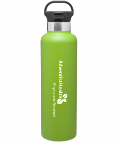 24 oz powder coated double wall 18/8 stainless steel thermal bottle with copper vacuum insulation, threaded gear-shaped insulated lid and carrying handle Complies with FDA, Prop 65. 11.25" H x 3" W