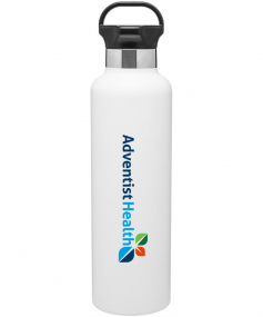 24 oz powder coated double wall 18/8 stainless steel thermal bottle with copper vacuum insulation, threaded gear-shaped insulated lid and carrying handle Complies with FDA, Prop 65. 11.25" H x 3" W