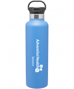 24 oz powder coated double wall 18/8 stainless steel thermal bottle with copper vacuum insulation, threaded gear-shaped insulated lid and carrying handle Complies with FDA, Prop 65. 11.25" H x 3" W