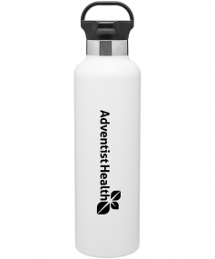 24 oz powder coated double wall 18/8 stainless steel thermal bottle with copper vacuum insulation, threaded gear-shaped insulated lid and carrying handle Complies with FDA, Prop 65. 11.25" H x 3" W