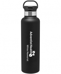 24 oz powder coated double wall 18/8 stainless steel thermal bottle with copper vacuum insulation, threaded gear-shaped insulated lid and carrying handle Complies with FDA, Prop 65. 11.25" H x 3" W