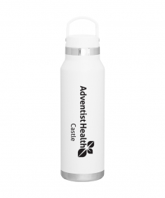 25 oz double wall 18/8 stainless steel thermal bottle with copper vacuum insulation, threaded insulated lid with carrying handle, high polish accent, stainless steel base, and powder coated finish. Hand wash recommended; Do not microwave. Dimensions: 10 H x 3".