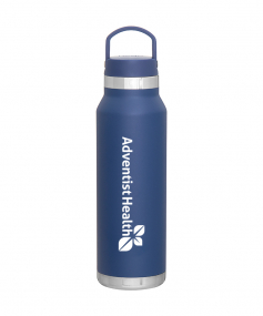 25 oz double wall 18/8 stainless steel thermal bottle with copper vacuum insulation, threaded insulated lid with carrying handle, high polish accent, stainless steel base, and powder coated finish. Hand wash recommended; Do not microwave. Dimensions: 10 H x 3".