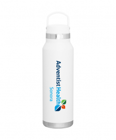 25 oz double wall 18/8 stainless steel thermal bottle with copper vacuum insulation, threaded insulated lid with carrying handle, high polish accent, stainless steel base, and powder coated finish. Hand wash recommended; Do not microwave. Dimensions: 10 H x 3".