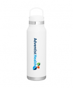 25 oz double wall 18/8 stainless steel thermal bottle with copper vacuum insulation, threaded insulated lid with carrying handle, high polish accent, stainless steel base, and powder coated finish. Hand wash recommended; Do not microwave. Dimensions: 10 H x 3".