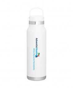 25 oz double wall 18/8 stainless steel thermal bottle with copper vacuum insulation, threaded insulated lid with carrying handle, high polish accent, stainless steel base, and powder coated finish. Hand wash recommended; Do not microwave. Dimensions: 10 H x 3".