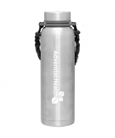 32 oz double wall 18/8 stainless steel thermal bottle with copper vacuum insulation, insulated stainless steel threaded lid, silicone ring, removable strap with buckles, removable clasps, and powder coated finish. Individual gift box. Hand wash recommended. Do not microwave. Complies with FDA, Prop 65. 11" H x 3.1875" W
