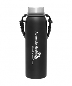 32 oz double wall 18/8 stainless steel thermal bottle with copper vacuum insulation, insulated stainless steel threaded lid, silicone ring, removable strap with buckles, removable clasps, and powder coated finish. Individual gift box. Hand wash recommended. Do not microwave. Complies with FDA, Prop 65. 11" H x 3.1875" W