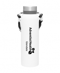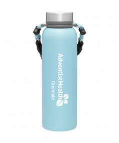 32 oz double wall 18/8 stainless steel thermal bottle with copper vacuum insulation, insulated stainless steel threaded lid, silicone ring, removable strap with buckles, removable clasps, and powder coated finish. Individual gift box. Hand wash recommended. Do not microwave. Complies with FDA, Prop 65. 11" H x 3.1875" W