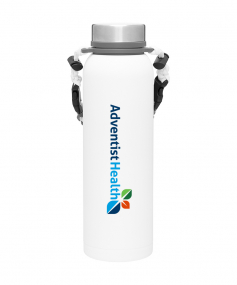 32 oz double wall 18/8 stainless steel thermal bottle with copper vacuum insulation, insulated stainless steel threaded lid, silicone ring, removable strap with buckles, removable clasps, and powder coated finish. Individual gift box. Hand wash recommended. Do not microwave. Complies with FDA, Prop 65. 11" H x 3.1875" W