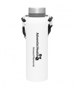 32 oz double wall 18/8 stainless steel thermal bottle with copper vacuum insulation, insulated stainless steel threaded lid, silicone ring, removable strap with buckles, removable clasps, and powder coated finish. Individual gift box. Hand wash recommended. Do not microwave. Complies with FDA, Prop 65. 11" H x 3.1875" W