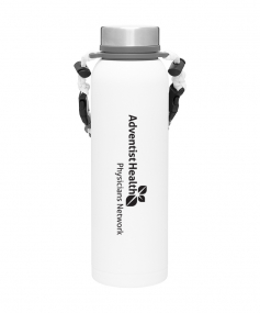 32 oz double wall 18/8 stainless steel thermal bottle with copper vacuum insulation, insulated stainless steel threaded lid, silicone ring, removable strap with buckles, removable clasps, and powder coated finish. Individual gift box. Hand wash recommended. Do not microwave. Complies with FDA, Prop 65. 11" H x 3.1875" W