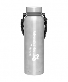 32 oz double wall 18/8 stainless steel thermal bottle with copper vacuum insulation, insulated stainless steel threaded lid, silicone ring, removable strap with buckles, removable clasps, and powder coated finish. Individual gift box. Hand wash recommended. Do not microwave. Complies with FDA, Prop 65. 11" H x 3.1875" W