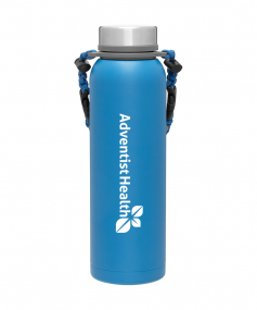 32 oz double wall 18/8 stainless steel thermal bottle with copper vacuum insulation, insulated stainless steel threaded lid, silicone ring, removable strap with buckles, removable clasps, and powder coated finish. Individual gift box. Hand wash recommended. Do not microwave. Complies with FDA, Prop 65. 11" H x 3.1875" W