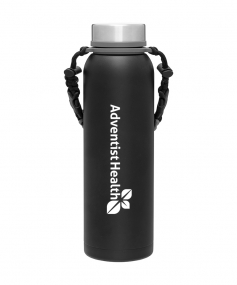 32 oz double wall 18/8 stainless steel thermal bottle with copper vacuum insulation, insulated stainless steel threaded lid, silicone ring, removable strap with buckles, removable clasps, and powder coated finish. Individual gift box. Hand wash recommended. Do not microwave. Complies with FDA, Prop 65. 11" H x 3.1875" W