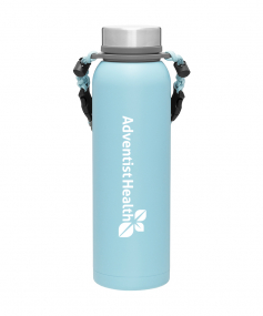 32 oz double wall 18/8 stainless steel thermal bottle with copper vacuum insulation, insulated stainless steel threaded lid, silicone ring, removable strap with buckles, removable clasps, and powder coated finish. Individual gift box. Hand wash recommended. Do not microwave. Complies with FDA, Prop 65. 11" H x 3.1875" W