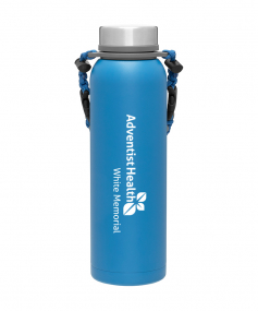 32 oz double wall 18/8 stainless steel thermal bottle with copper vacuum insulation, insulated stainless steel threaded lid, silicone ring, removable strap with buckles, removable clasps, and powder coated finish. Individual gift box. Hand wash recommended. Do not microwave. Complies with FDA, Prop 65. 11" H x 3.1875" W