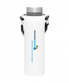 32 oz double wall 18/8 stainless steel thermal bottle with copper vacuum insulation, insulated stainless steel threaded lid, silicone ring, removable strap with buckles, removable clasps, and powder coated finish. Individual gift box. Hand wash recommended. Do not microwave. Complies with FDA, Prop 65. 11" H x 3.1875" W