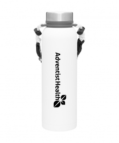 32 oz double wall 18/8 stainless steel thermal bottle with copper vacuum insulation, insulated stainless steel threaded lid, silicone ring, removable strap with buckles, removable clasps, and powder coated finish. Individual gift box. Hand wash recommended. Do not microwave. Complies with FDA, Prop 65. 11" H x 3.1875" W