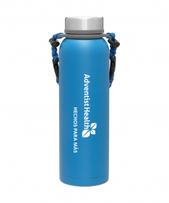 32 oz double wall 18/8 stainless steel thermal bottle with copper vacuum insulation, insulated stainless steel threaded lid, silicone ring, removable strap with buckles, removable clasps, and powder coated finish. Individual gift box. Hand wash recommended. Do not microwave. Complies with FDA, Prop 65. 11" H x 3.1875" W