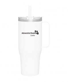 40 oz double wall 18/8 stainless steel thermal mug with copper vacuum insulation, stainless steel rim, dual-purpose push-on clear lid, matching sliding closure, flexible wide silicone straw, and powder coated finish. Individual gift box. Hand wash recommended. Do not microwave. Complies with FDA, Prop 65. 9.75" H x 4" W