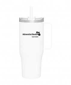 40 oz double wall 18/8 stainless steel thermal mug with copper vacuum insulation, stainless steel rim, dual-purpose push-on clear lid, matching sliding closure, flexible wide silicone straw, and powder coated finish. Individual gift box. Hand wash recommended. Do not microwave. Complies with FDA, Prop 65. 9.75" H x 4" W
