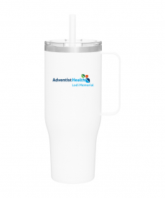 40 oz double wall 18/8 stainless steel thermal mug with copper vacuum insulation, stainless steel rim, dual-purpose push-on clear lid, matching sliding closure, flexible wide silicone straw, and powder coated finish. Individual gift box. Hand wash recommended. Do not microwave. Complies with FDA, Prop 65. 9.75" H x 4" W