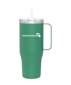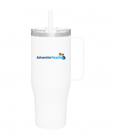 40 oz double wall 18/8 stainless steel thermal mug with copper vacuum insulation, stainless steel rim, dual-purpose push-on clear lid, matching sliding closure, flexible wide silicone straw, and powder coated finish. Individual gift box. Hand wash recommended. Do not microwave. Complies with FDA, Prop 65. 9.75" H x 4" W