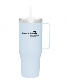 40 oz double wall 18/8 stainless steel thermal mug with copper vacuum insulation, stainless steel rim, dual-purpose push-on clear lid, matching sliding closure, flexible wide silicone straw, and powder coated finish. Individual gift box. Hand wash recommended. Do not microwave. Complies with FDA, Prop 65. 9.75" H x 4" W