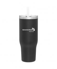 40 oz double wall 18/8 stainless steel thermal tumbler with copper vacuum insulation, stainless steel rim, dual-purpose push-on clear lid, matching sliding closure, flexible wide silicone straw, and powder coated finish