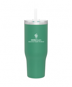 40 oz double wall 18/8 stainless steel thermal tumbler with copper vacuum insulation, stainless steel rim, dual-purpose push-on clear lid, matching sliding closure, flexible wide silicone straw, and powder coated finish