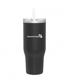 40 oz double wall 18/8 stainless steel thermal tumbler with copper vacuum insulation, stainless steel rim, dual-purpose push-on clear lid, matching sliding closure, flexible wide silicone straw, and powder coated finish