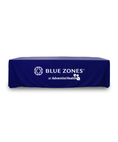 8 ft. Premium PolyKnit throw table cover with one color logo. Fits a 96 inch wide x 30 inch deep table. All corners are rounded meaning they will not gather and lay on the floor. Floor length on 4 sides. This cloth requires no ironing, is EasyCare machine washable and dryer safe.