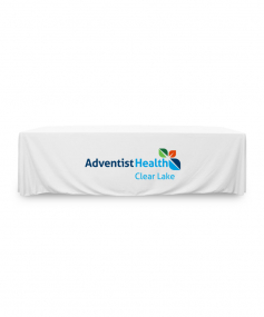 8 ft. Premium PolyKnit throw table cover with one color logo. Fits a 96 inch wide x 30 inch deep table. All corners are rounded meaning they will not gather and lay on the floor. Floor length on 4 sides. This cloth requires no ironing, is EasyCare machine washable and dryer safe.
